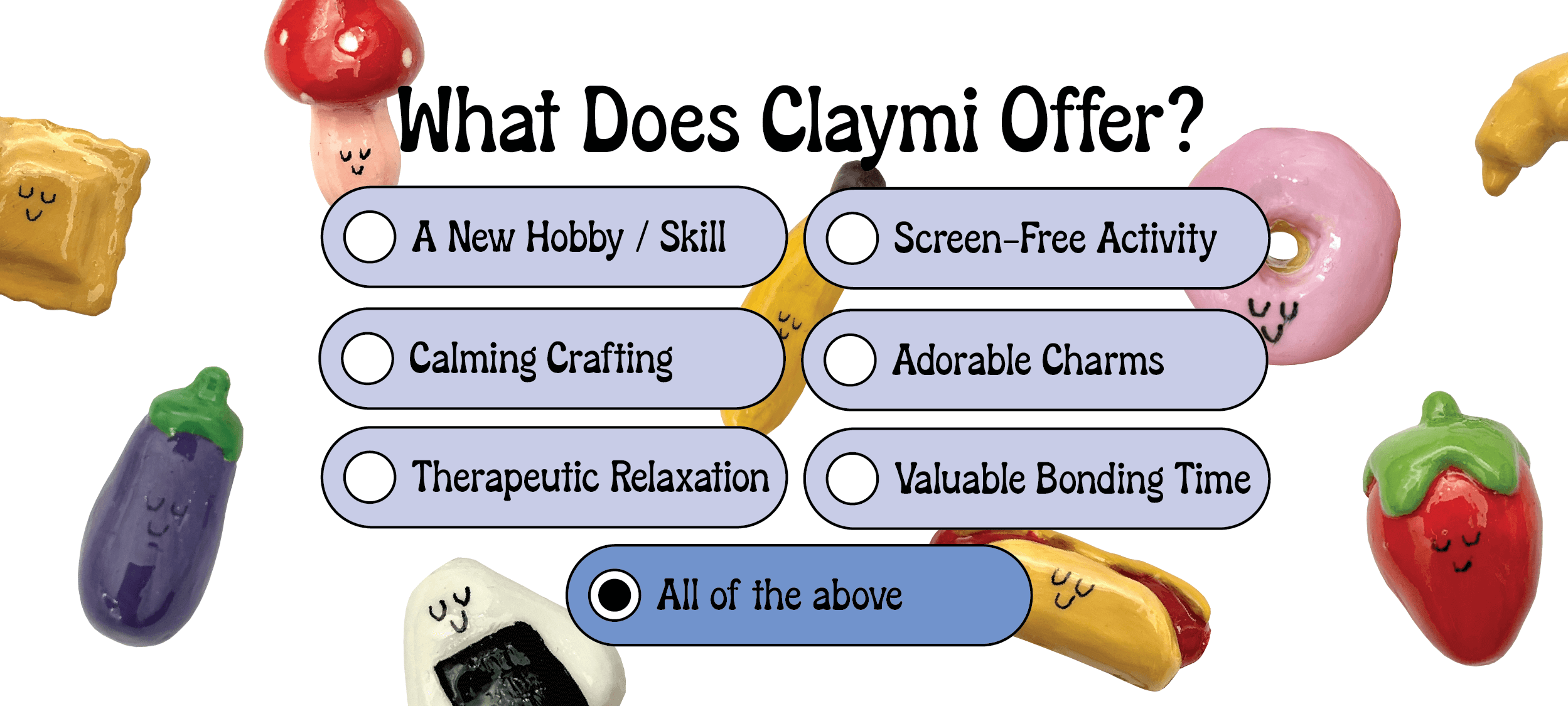 Claymi kits offer hours of quality screen-free time with hands-on fun that you can enjoy across multiple days—perfect as a solo hobby, a fun gift, or a laid-back activity with friends or coworkers.