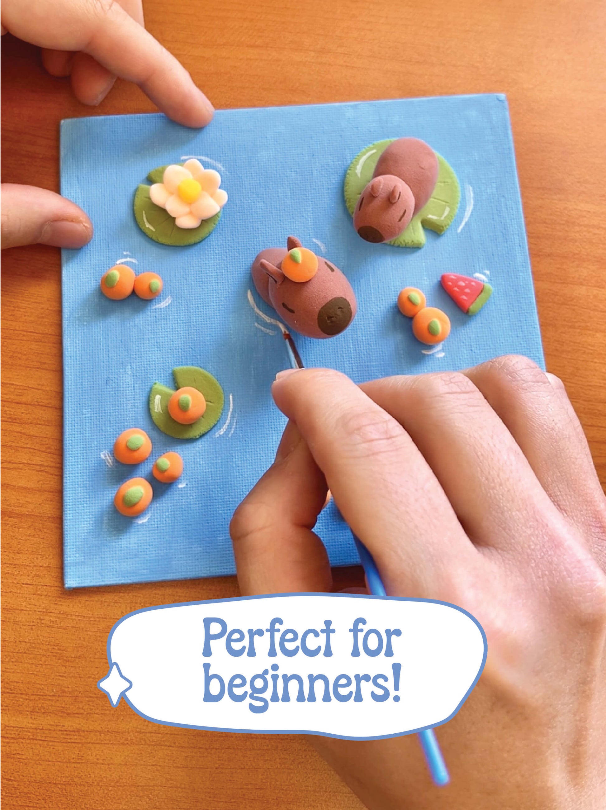 A cosy 3D scene featuring two adorable capybaras, surrounded by fruits, lotus flowers, and soft nature-inspired details. You’ll paint your background canvas, sculpt each element with air foam clay, then assemble everything into a layered, textured artwork that feels alive and full of personality.